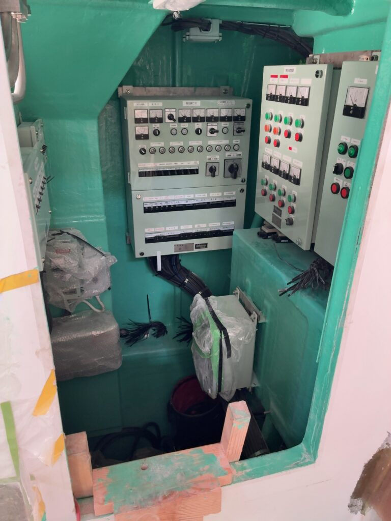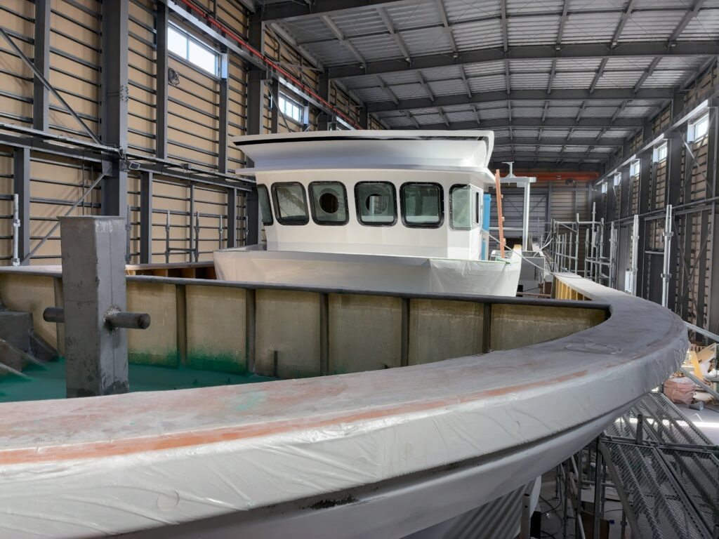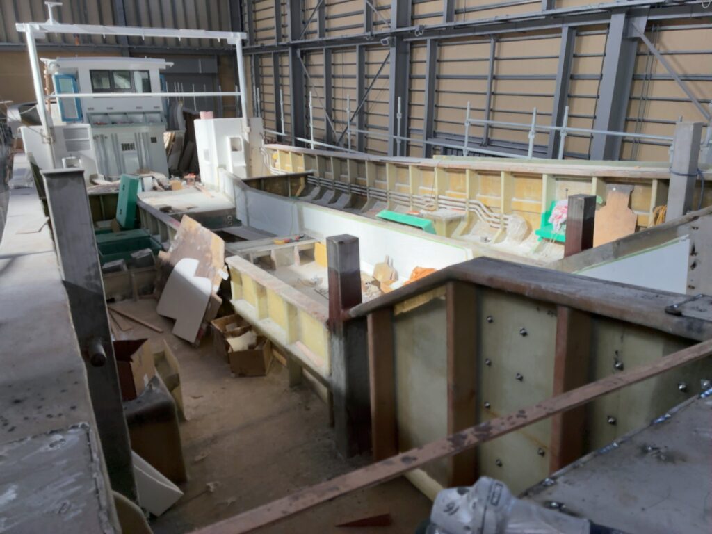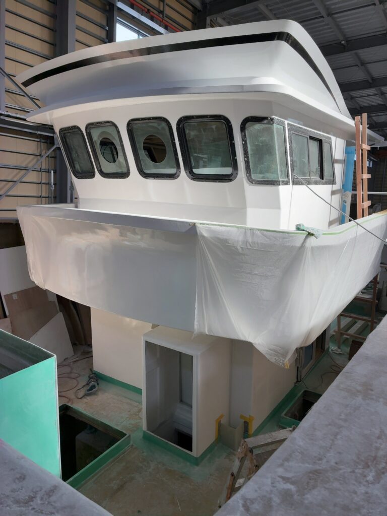 建造中の19t船に操舵室が搭載され、漁船らしい外観も見え始めてきました。いよいよ大詰め。艤装(ぎそう)工事などが行われ、デッキ部分や内部の造り込みが進んでいます。